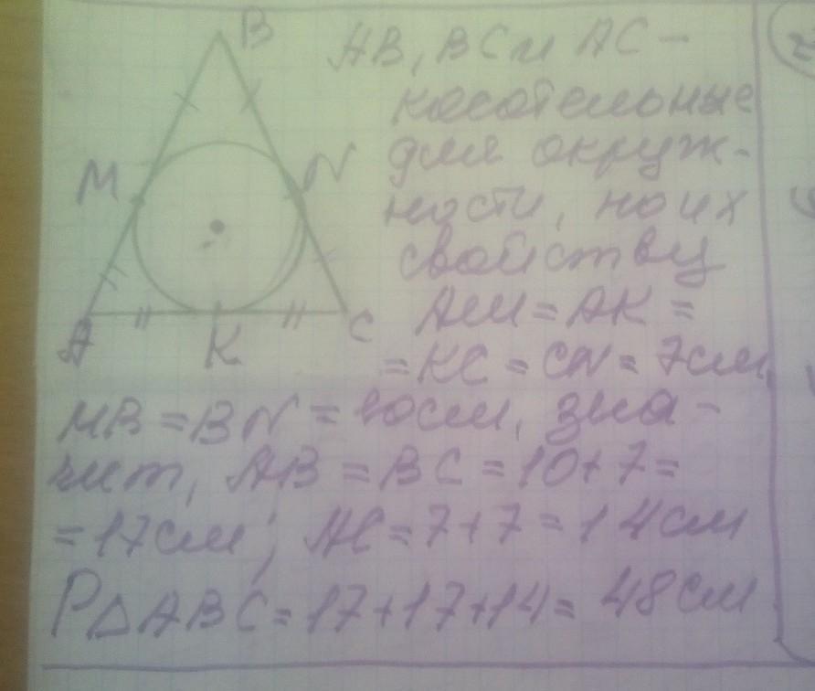 Коло, вписане в рівнобедрений трикутник, ділить його бічну сторону на відрізки 10 см і 7 см, починаючи від вершини трикутника, протилежної до основи. Знайдіть периметр трикутника.