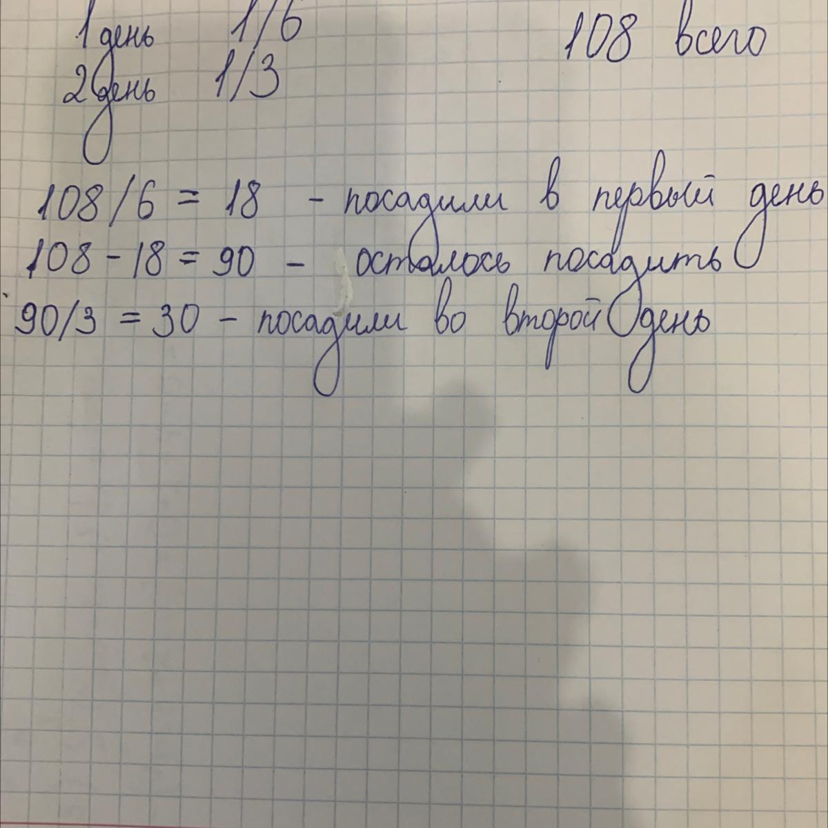 В первый день посадили 1/6 от всех груш, во второй 1/3 от остальных. Сколько деревьев посадили во второй день, если было всего 108 деревьев?