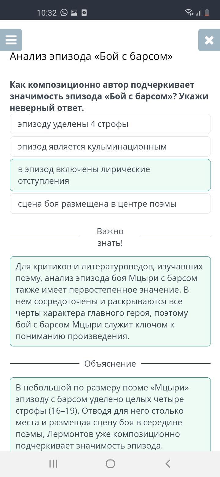 Как композиционно автор подчеркивает значимость эпизода «Бой с барсом»? Укажи неверный ответ.
