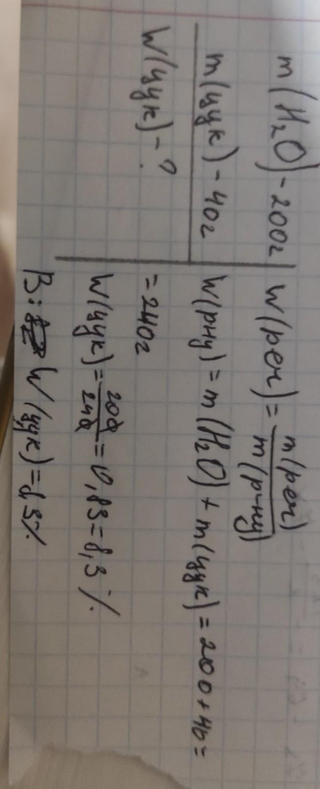 У 200 мл. води розчинили 40 г. цукру. Яка масова частка цукру в утвореному розчині? СРОЧНО ОТВЕТ!!