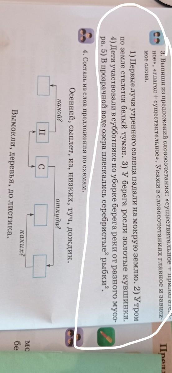 Первые лучи (главное слово - лучи, зависимое - первые),утреннего солнца (гл. Слово - солнца, зав. - утреннего),на мокрую землю (гл. - землю, зав. - мокрую),