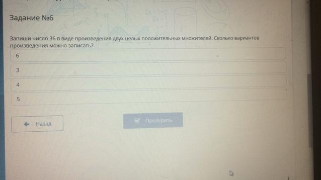 Запиши число 36 в виде произведения двух целых положительных множителей. Сколько вариантов