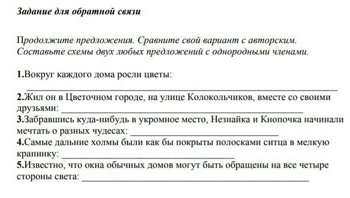 Продолжите предложения. Сравните свой вариант с авторским. Составьте схемы двух любых предложений с однородными членами. 1.Вокруг каждого дома росли цветы:_____ 2.Жил он в Цветочном городе, на улице Колокольчиков, вместе со своими друзьями:______3.Забравшись куда-нибудь в укромное место, Незнайка и Кнопочка начинали мечтать о разных чудесах:______ 4. Самые дальние холмы были как бы покрыты полосками ситца в мелкую крапинку:______ 5.Известно, что окна обычных домов могут быть обращены на все четыре стороны света:_____