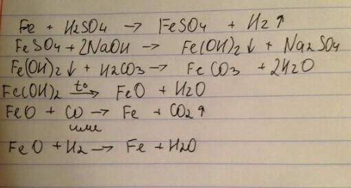 KOH -> Fe(OH)2 -> FeO-> FeSO4 -> Fe(OH)2 –> FeCO3