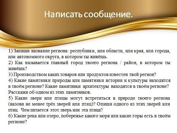 Я живу в *название республики*. Её столица – *название города*. В моём регионе создали *товары/продукты*, и я очень горжусь этим. Так же тут есть не мало памятников. Например, памятники *писателю*, *художнику*, *поэту* – очень известные достопримечательности моей республики.