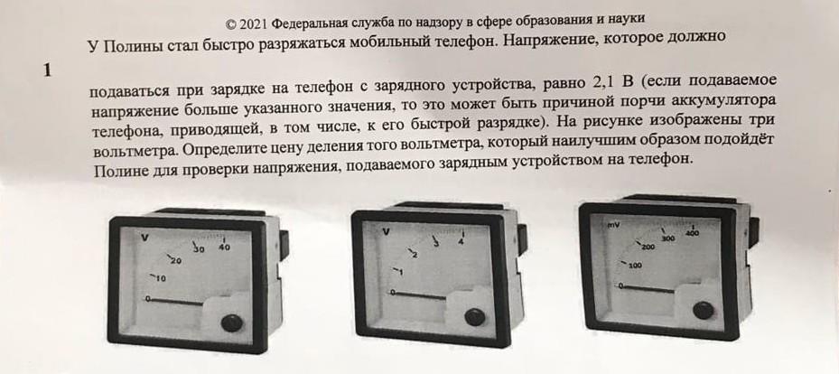 У Полины стал быстро разряжаться мобильный телефон. Напряжение, которое должно подаваться при зарядке на телефон с зарядного устройства, равно 2,1 В. (Если подаваемое напряжение больше указанного значения, то это может быть причиной порчи аккумулятора телефона, приводящей, в том числе, к его быстрой разрядке). На рисунке изображены три вольтметра. Определите цену деления того вольтметра, который наибольшим образом подойдёт Полине для проверки напряжения, подаваемого зарядным устройством на телефон.