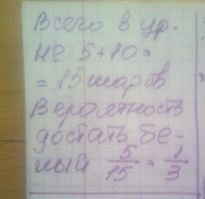 З урни у якій є 5 білих і 10 червоних куль навмання виймають одну кулю. Знайдіть імовірність того що вийнята куля виявиться білою.
