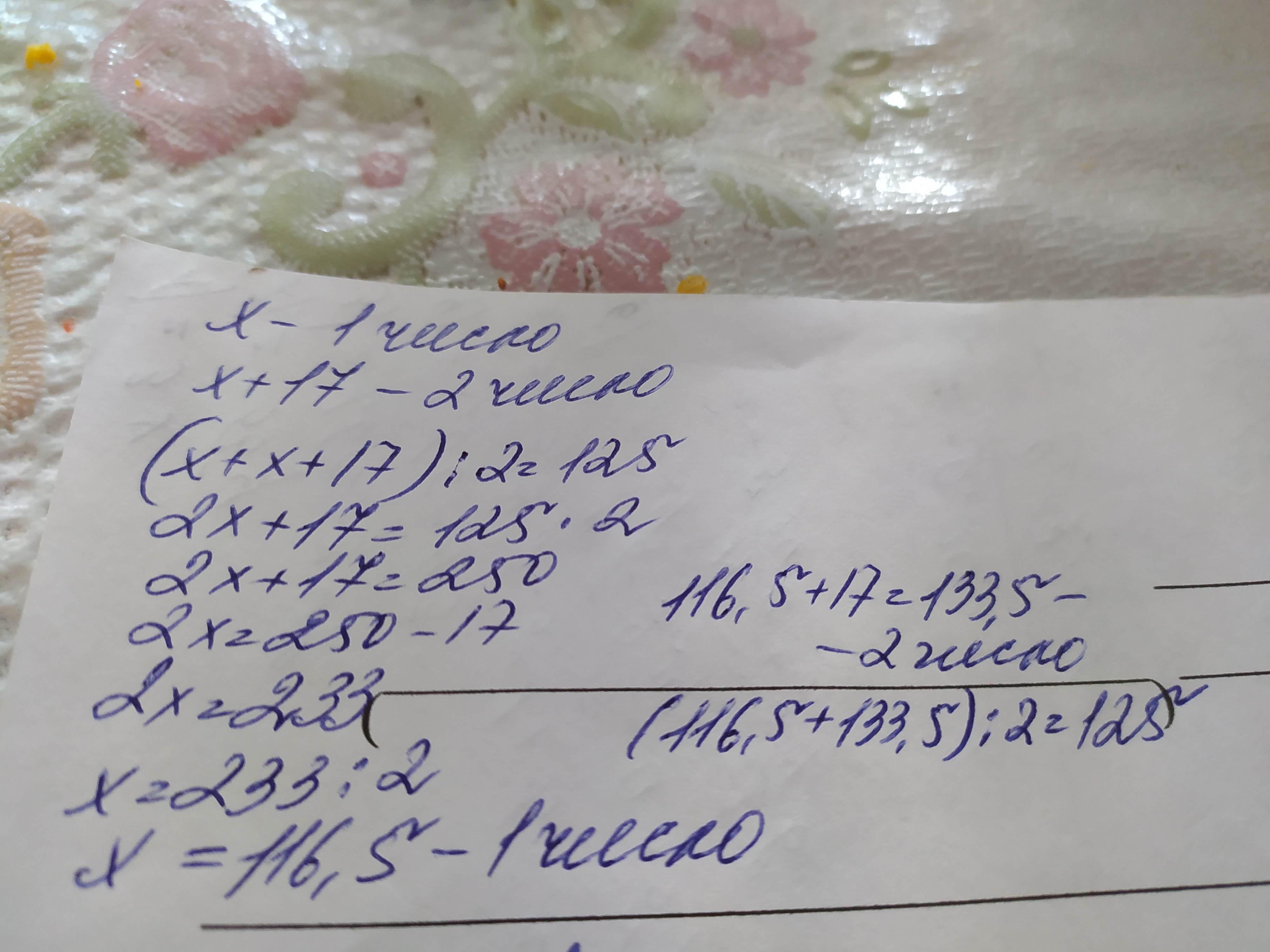 Два числа середне арифметичне цих чисел 125 друге число більше за перше на 17 . Знайди ці числа. Люди допоможіть будь ласка мені це дуже потрібно.