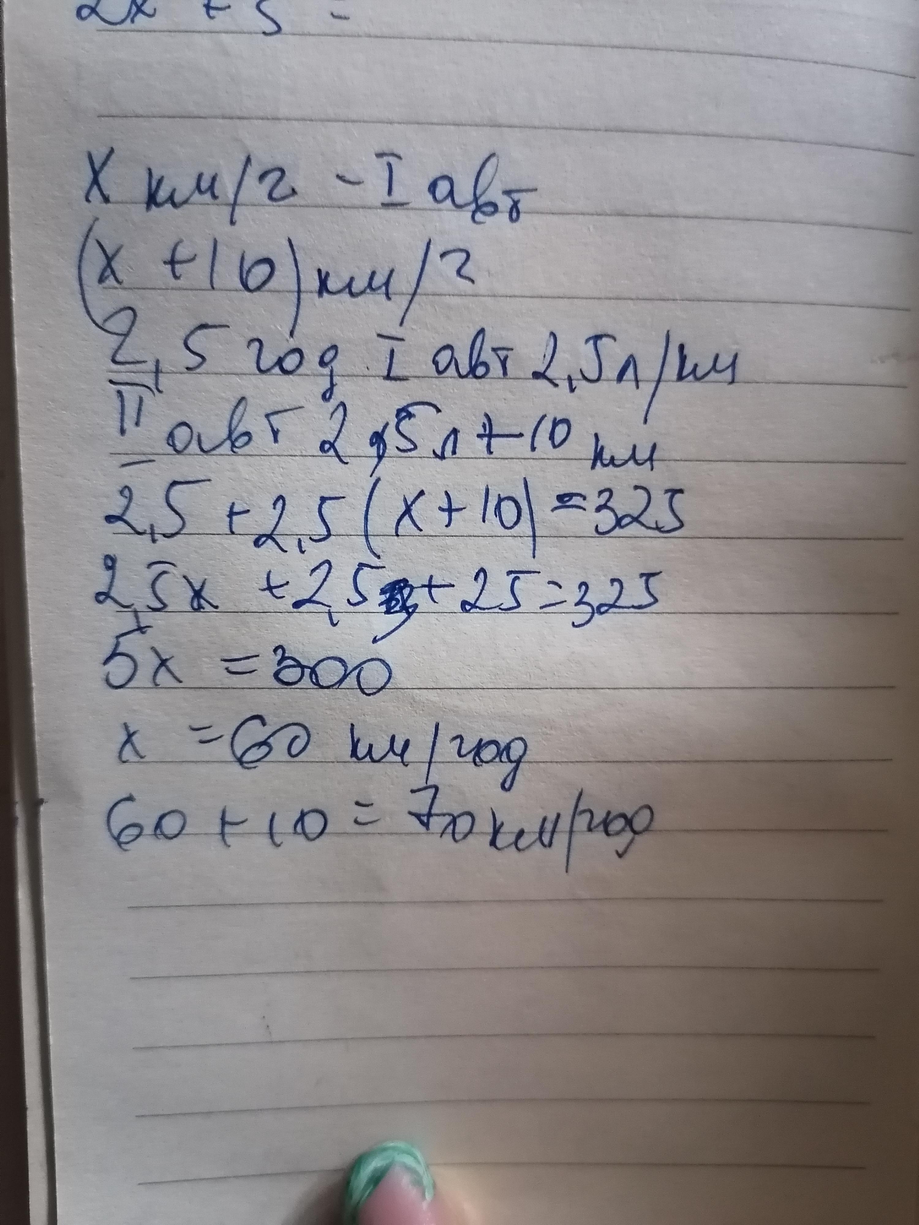 Два автомобілі виїхали одночасно назустріч один одному з двох пунктів, відстань між якими дорівнює 325 км, і зустрілися через 2,5 год. Знайдіть швидкість кожного автомобіля, якщо швидкість одного з них на 10 км/год більша, ніж швидкість іншого. Решите уровнением, пожалуйста.