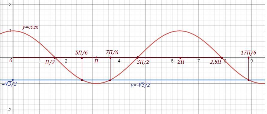 найти все, принадлежащие отрезку [0;2,5π] корни уравнения cosx=-3/√2 с помощью графика функции