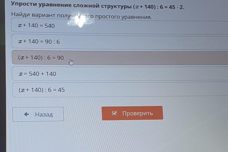 Упрости уравнение сложной структуры (Т+ 140) : 6 = 45 - 2.
