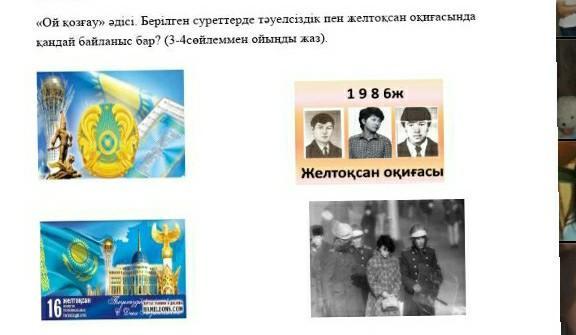 "Ой қозғау"әдісі Берілген суреттерде тәуелсіздік пен желтоқсан оқиғасында щандай байланыс бар (3-4сөйлемнен жаз)