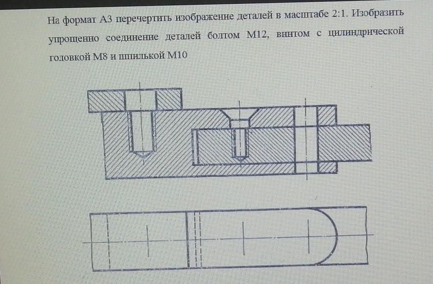 На формат А3 перечертить изображение деталей в масштабе 2:1. Изобразить упрощенно соединение деталей болтом М12, винтом с цилиндрической головкой М8 и шпилькой М10.