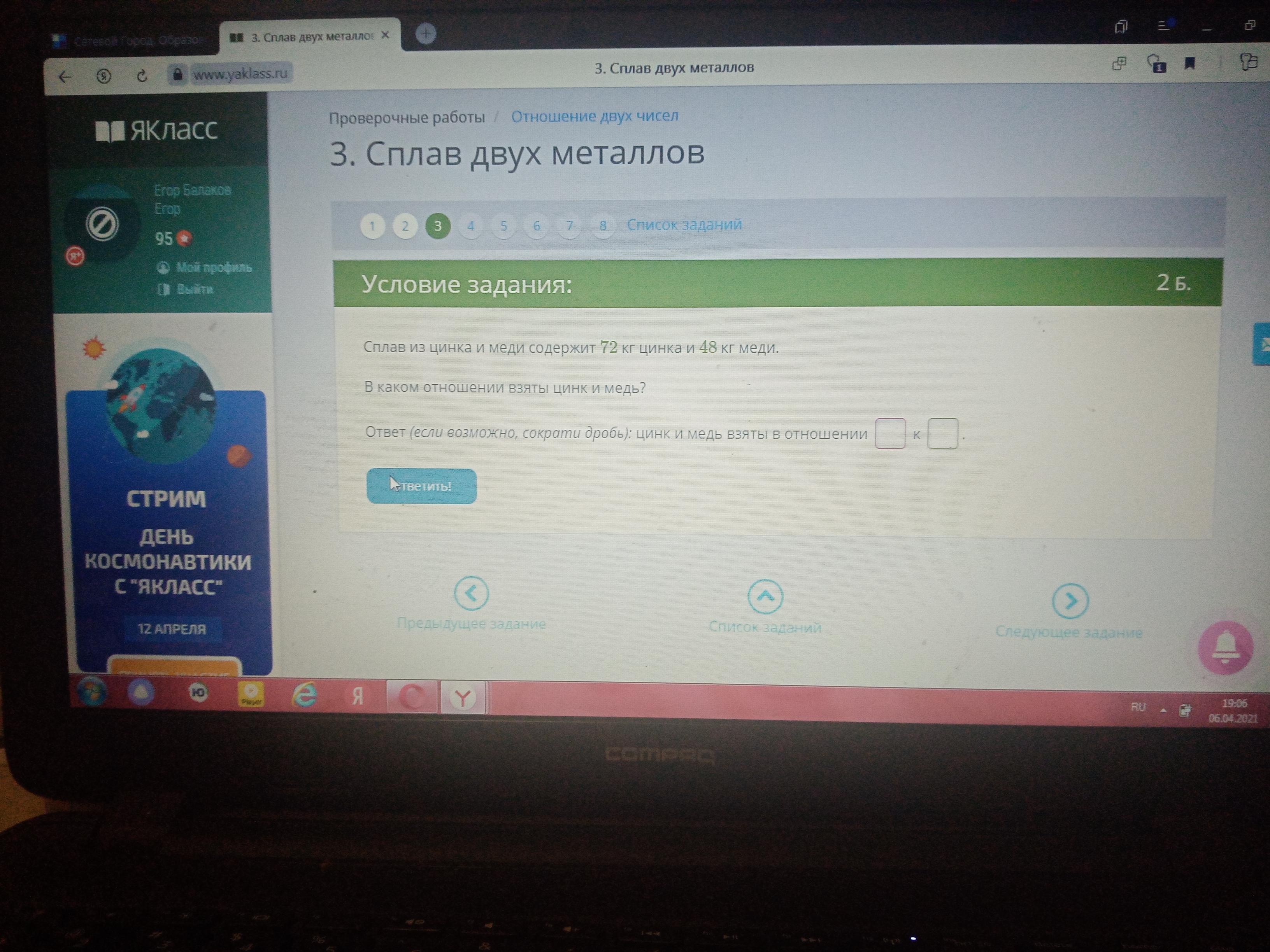 Общий сплав равен 120, отсюда медь 48/120=4/10, а цинка 72/120=6/10
