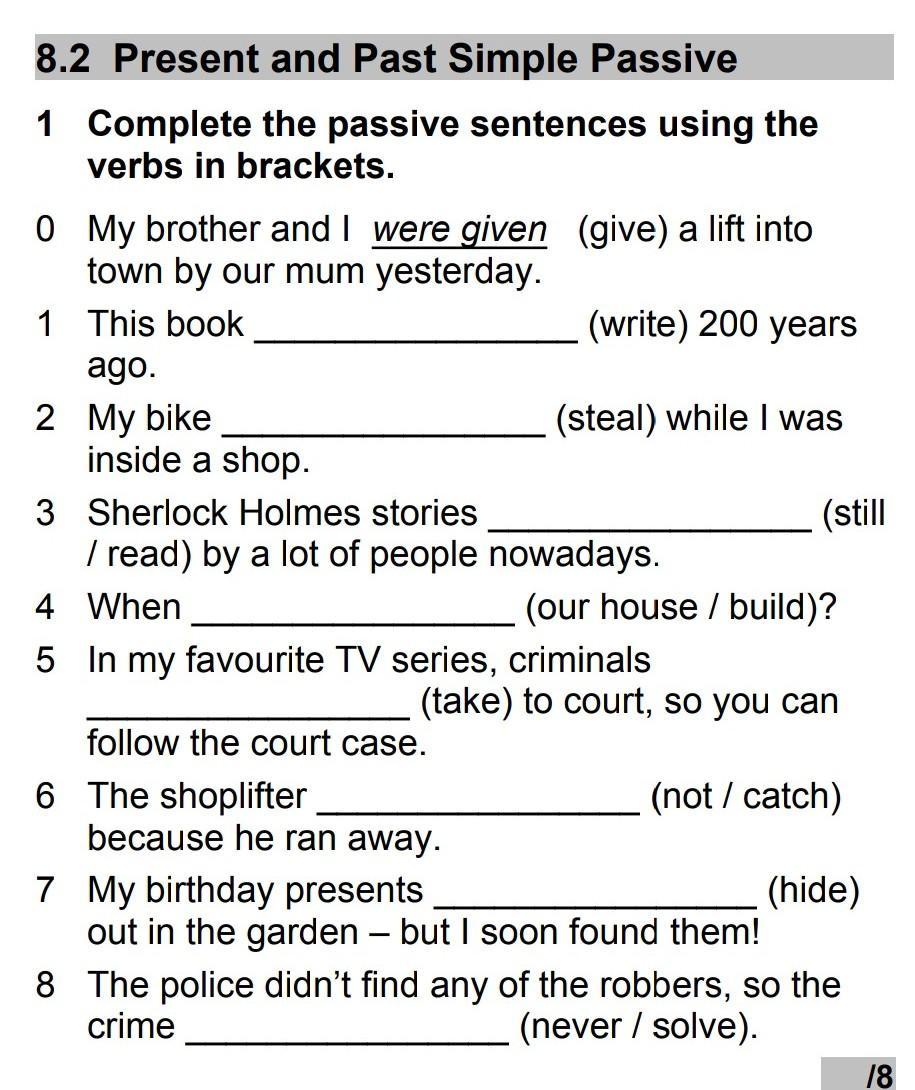 1 was written 2 was stolen 3 are still read 4 was builr 5 are taken 6 wasnt caught 7were hidden 8 was never solved