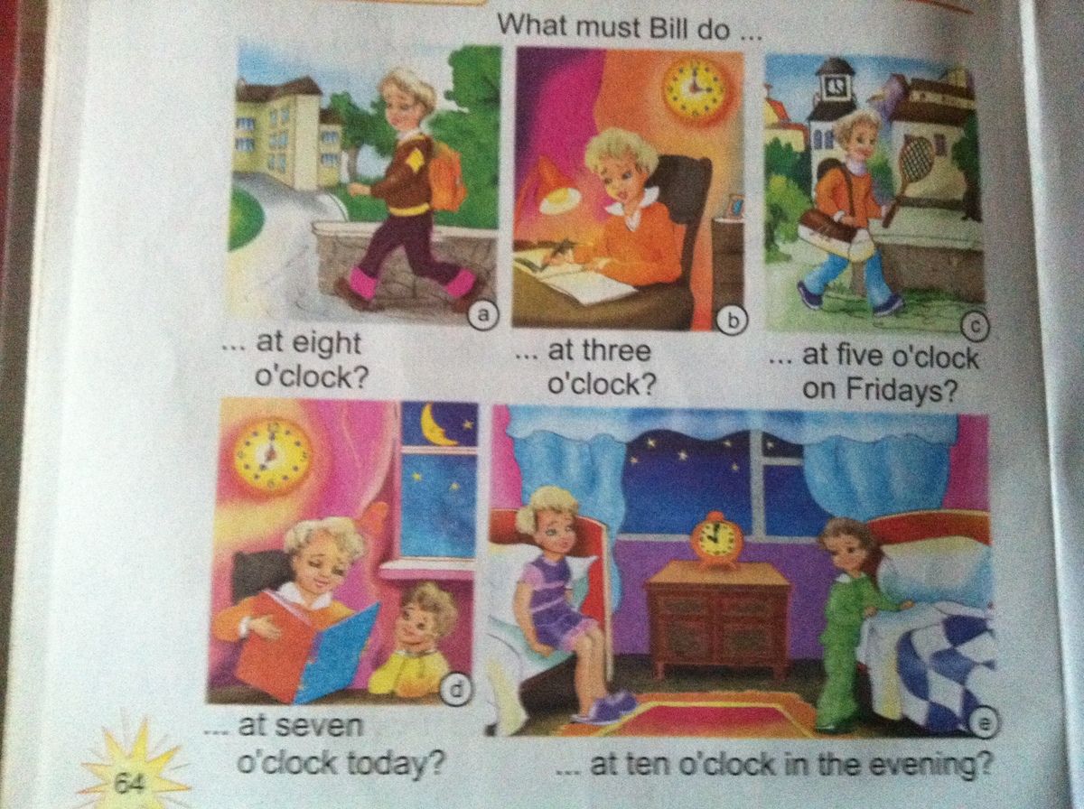 Bill must go to school at 8 o clock. Bill must do his homework at three o clock. Bill must play tennis at five o clock on Fridays. Bill must listen to the fairy tale. Bill must go to bed at ten o clock.