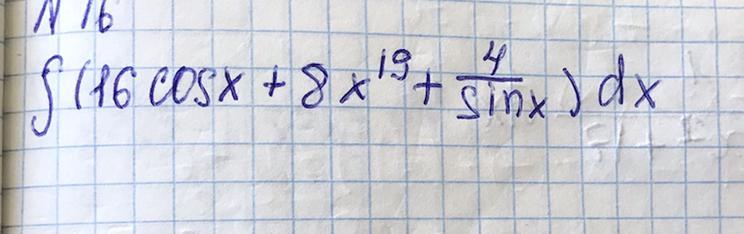 \int\limits(16 \cos(x)  + 8 {x}^{19} +  \frac{4}{ \sin(x) }  )dx =  \\  = 16  \int\limits\cos(x) dx + 8  \int\limits{x}^{19} dx + 4 \int\limits \frac{1}{ \sin(x) } dx =  \\  = 16 \sin(x)  + 8 \times  \frac{ {x}^{20} }{20}  + 4ln |tg \frac{x}{2} |  + C=  \\  = 16 \sin(x) +  \frac{2 {x}^{20} }{5}   + 4ln |tg \frac{x}{2} |  + C