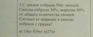 С грядки собрали 30кг овощей. Свеклы собрали 30%, моркови 60% от общего количества овощей. Сколько кг моркови и свеклы собрали с грядки?