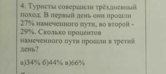 туристы совершили трёхдневний поход.в первый день они прошли 27% намеченоо пути, во второй 29%. сколько процентов наменого прошли в третий день?