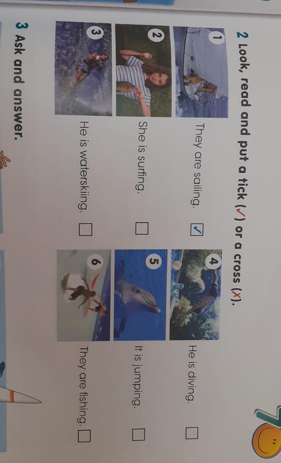 7 2 Look, read and put a tick ( sqrt ) ) or a cross (X). 1 4 They are sailing He is diving 2 5 She is surfing. It is jumping. 3 6 He is waterskiing. They are fishing. зделайте пожалуйста
