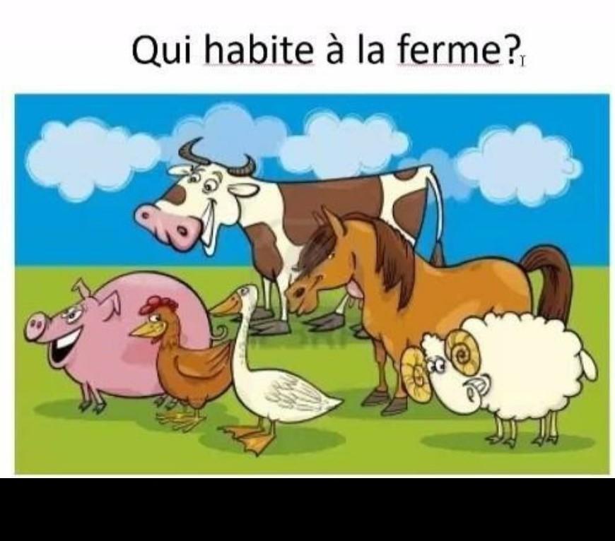 Le mouton, la vache, le cheval, la poule, le cochon, le canard habitent à la ferme.