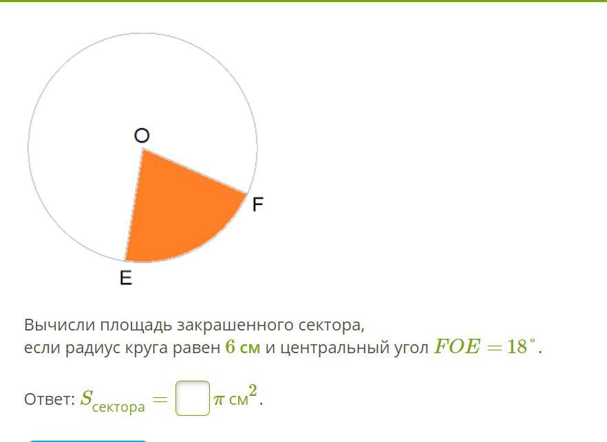 Площадь (S) сектора круга равняется площади круга, умноженной на угол сектора в градусах (α°) и деленной на 360°.