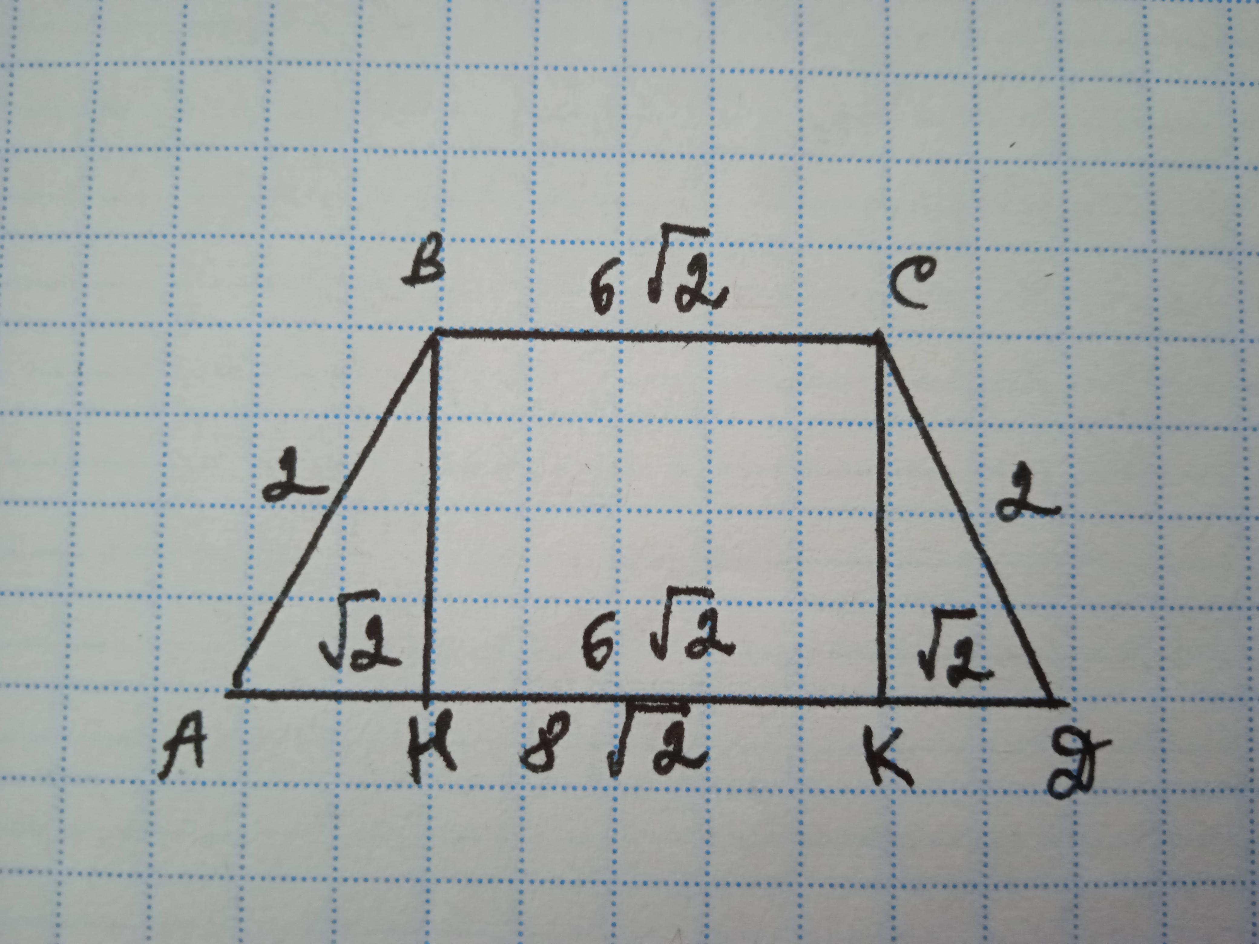 КН=ВС=6√2 см, АН=КD=(8√2-6√2):2=√2 см.