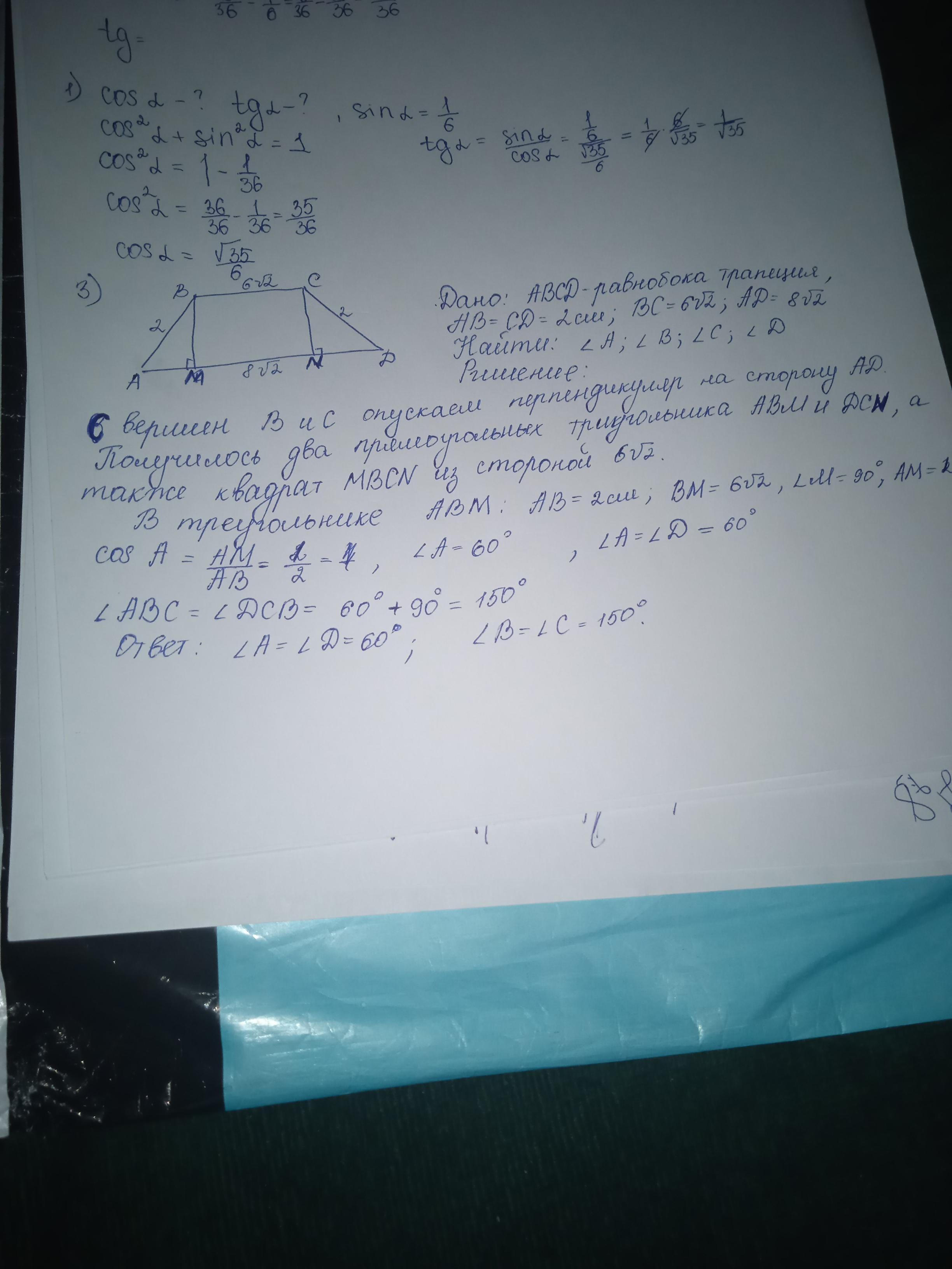 ΔАВН; cosA=√2/2; ∠А=45°; ∠D=∠А=45°
