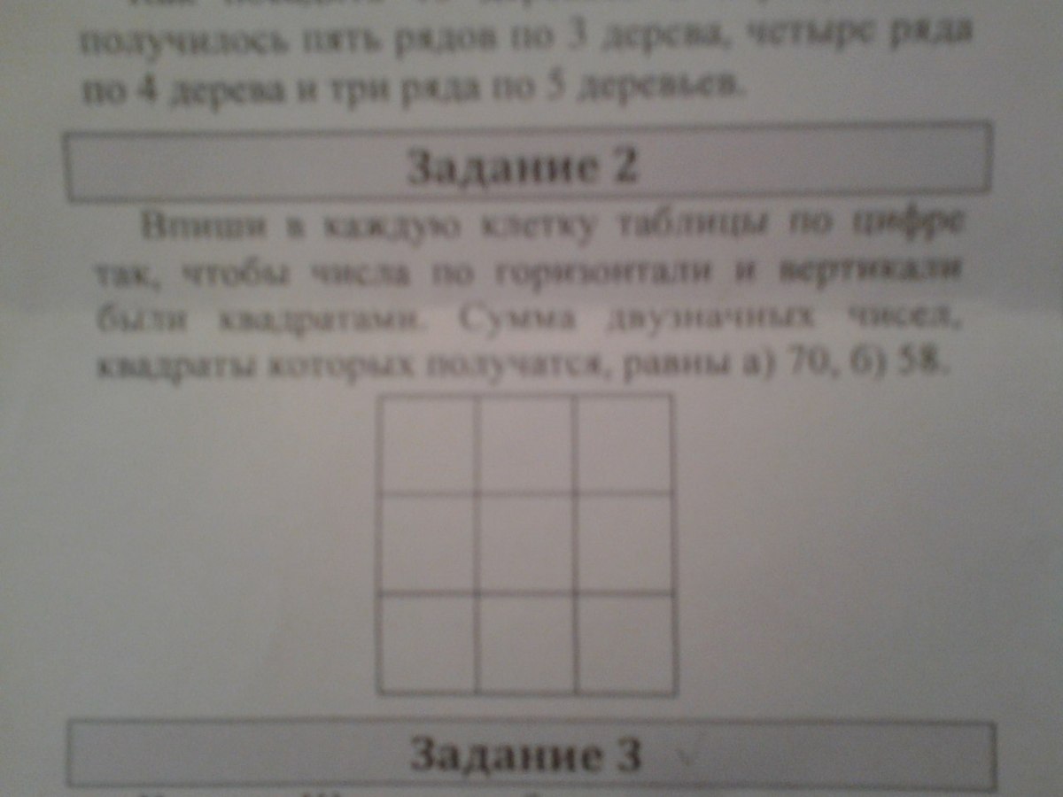 Впиши в каждую клетку таблицу по цифре так, чтобы числа по горизонтали и вертикали были квадраты. Сумма двухзначных чисел, квадраты которых получатся, равны а) 70, б)