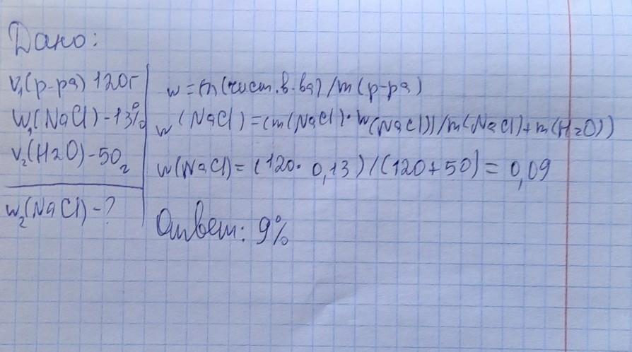 До розчину масою 120 г з масовой часткою моды 13% долили 50 г води. Яка масова частка утвореного розчину?