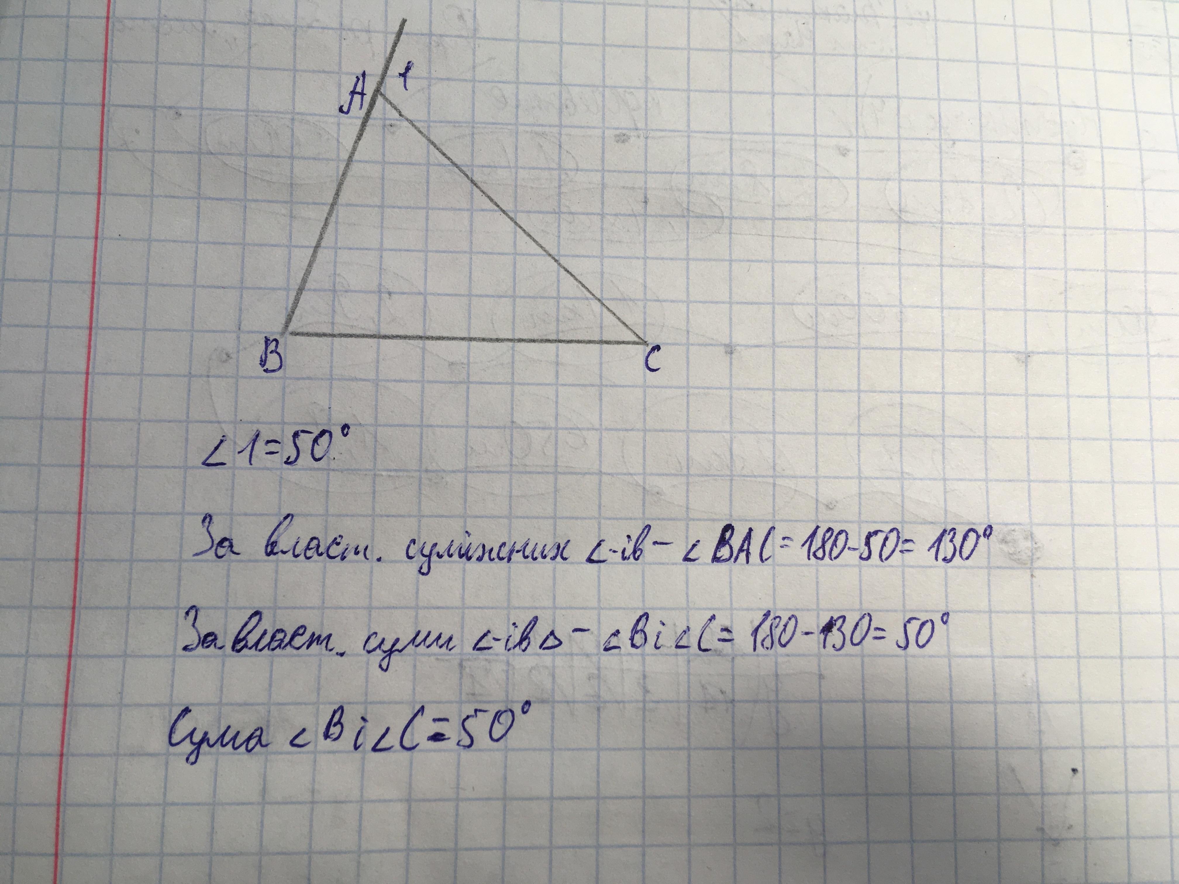 один із зовнішніх кутів трикутника дорівнює 50°. Чому дорівнює сума двох внутрішніх кутів трикутника не суміжних із ним?