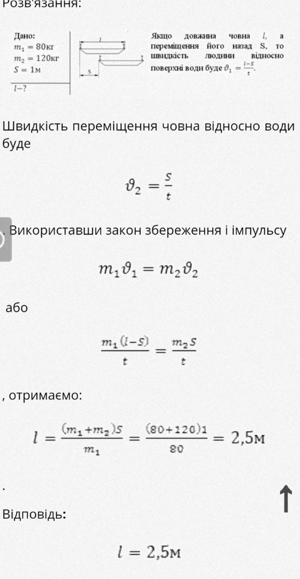 1. Човен масою 120 кг знаходиться в нерухомій воді. Рибалка, маса якого 80 кг, знаходиться в човні і переходить з одного кінця човна на інший. Яка довжина човна, якщо він при русі перемістився відносно поверхні води на 1м. Опором води знехтувати.