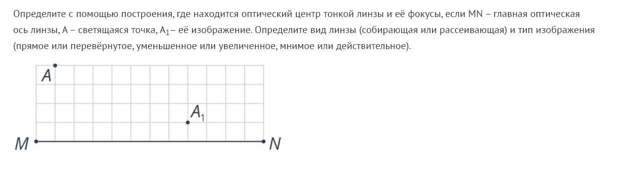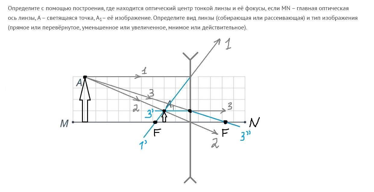 Так как и изображение и предмет находятся по одну сторону от линзы, а точка А1 является изображением и находится ближе к линзе, чем предмет, то напрашивается вывод: линза является рассеивающей. А фокусы у рассеивающей линзы мнимые. Значит через главный фокус, причём левый, будет проходить не преломлённый луч 1, а его продолжение 1'.