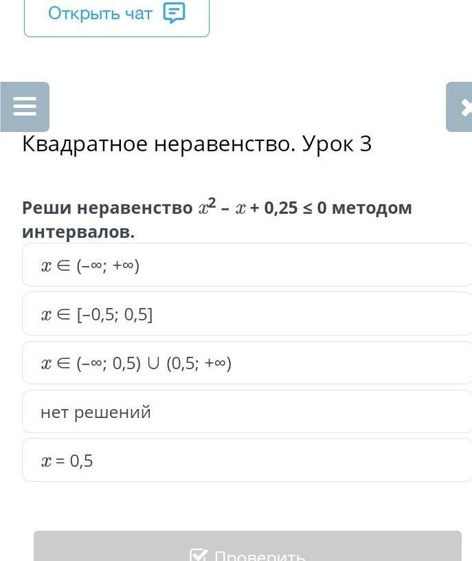 Реши неравенство x2 – x + 0,25 ≤ 0 методом интервалов.