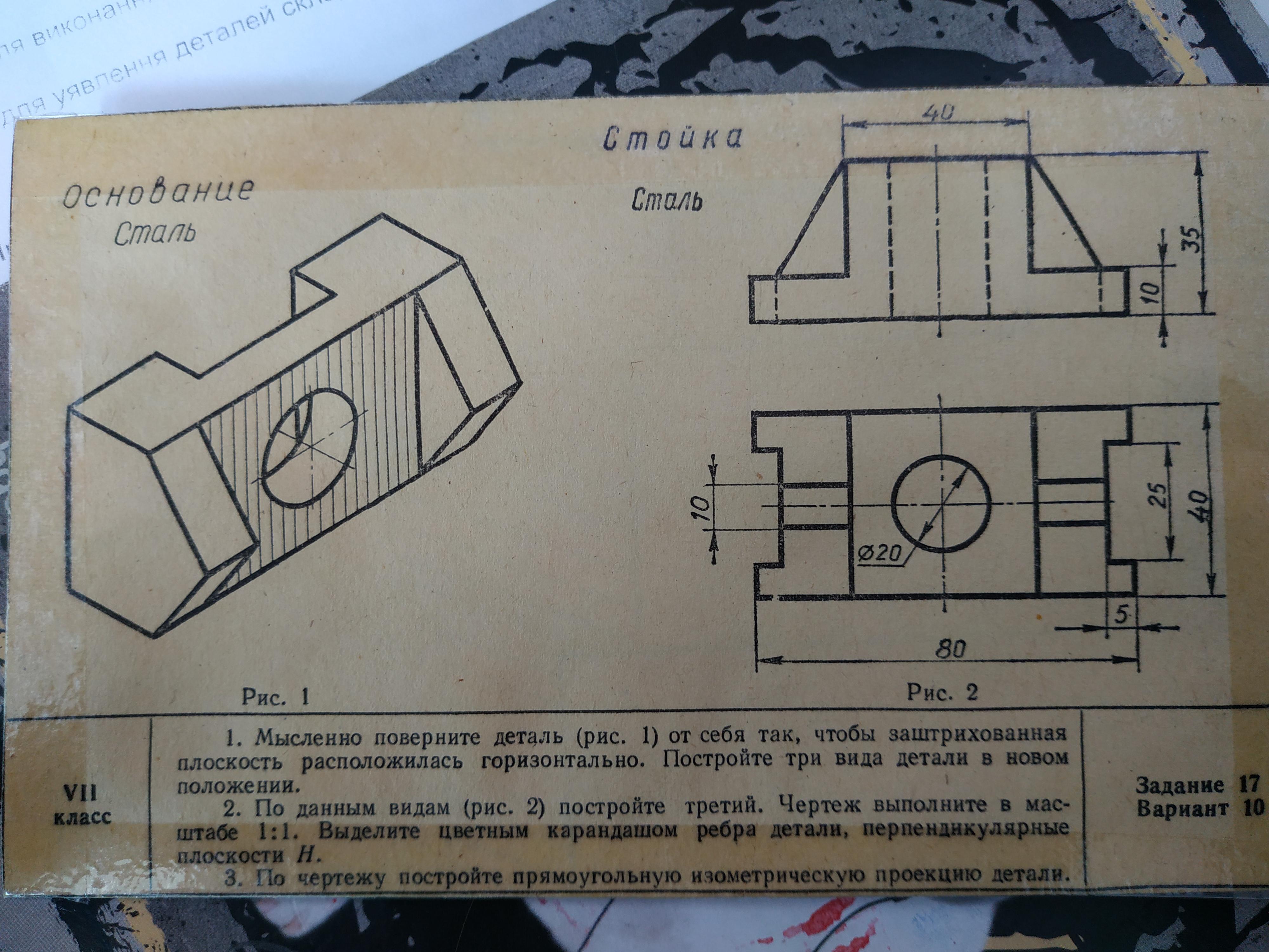 Построение чертежа детали из трёх проекций, выполненное от руки и сохранением пропорций на глаз, см. на фото.