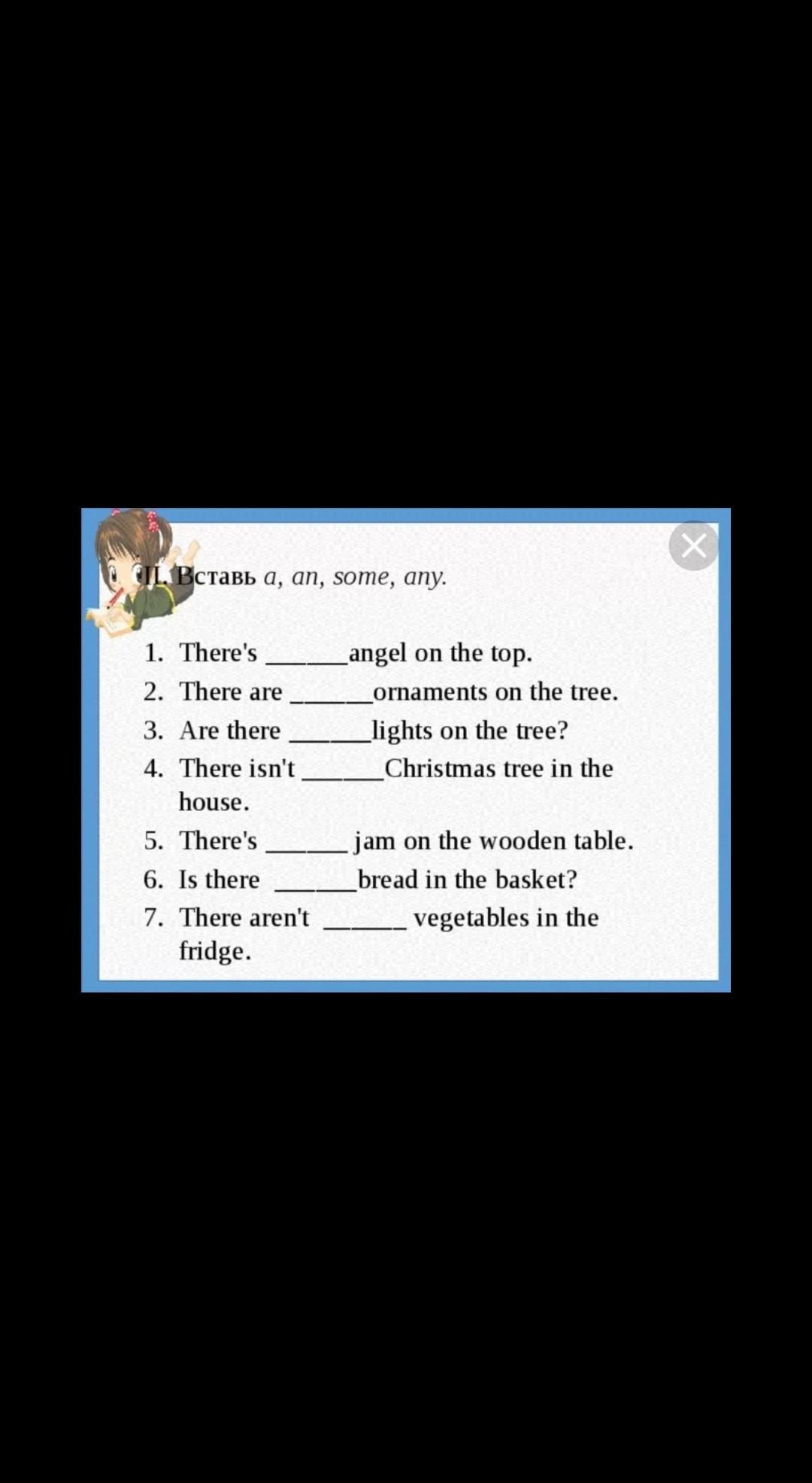 Ответ: 1) An; 2) Some; 3) Any; 4) Any; 5) Some; 6) Some; 7) Any.