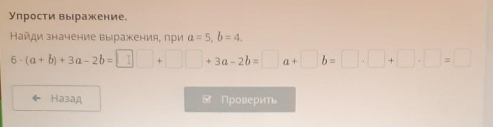 6*(а+b)+3a-2b=_._ + _._ +3a-2b= _ a+ _ b= _ * _ + _ * _ = _
