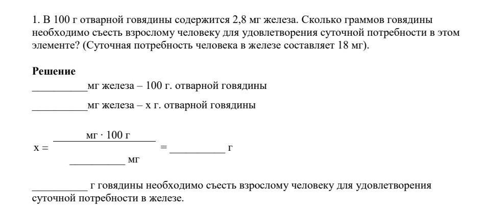 1. В 100 г отварной говядины содержится 2,8 мг железа. Сколько граммов говядины необходимо съесть взрослому человеку для удовлетворения суточной потребности в этом элементе? (Суточная потребность человека в железе составляет 18 мг).