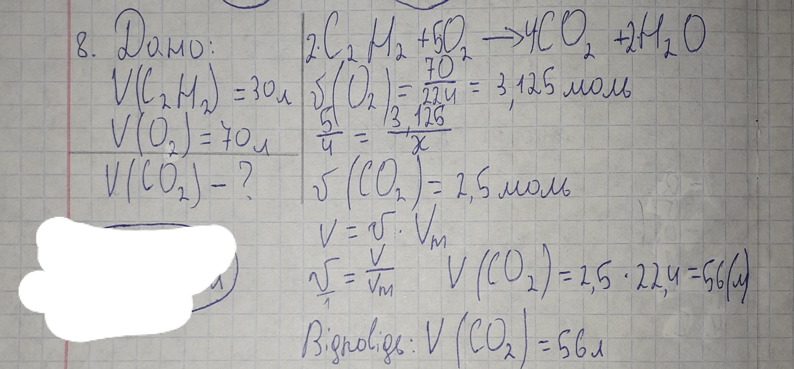 Розрахуйте об’єми газів, що залишились після реакції 30л ацетилену і 70л кисню.