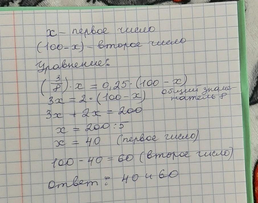Сумма двух чисел равна 100. 3/8 части от первого числа равны 25% от второго. Найдите эти числа.
