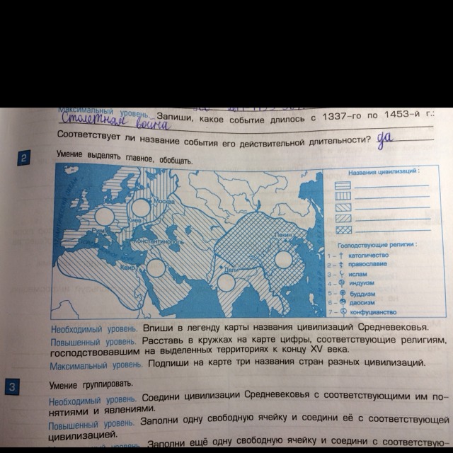 Москва, Киев - Русь(православие), Константинополь - Византия(православие), Рим - Западная Римская Империя(католичество), Дели - Делийский султанат(ислам), Пекин - Китайская империя(конфуцианство, даосизм).