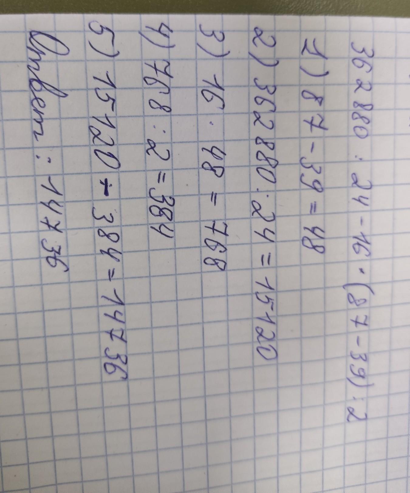 Найди значение выражения 362880:24−16⋅(87−39):2. (Впиши только результаты!)