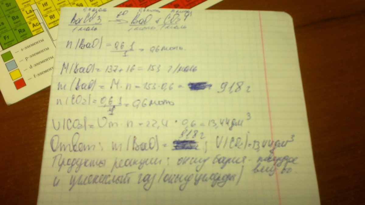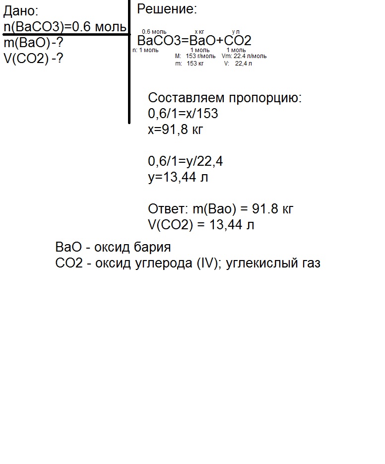 ЗАДАЧА ПО ХИМИИ 8 КЛАСС!При сильном нагревании ,барий карбонат,количеством вещества 0,6 моль,разложили на два оксида.Вычислите массу твёрдого остатка и объём газа (при н.у.).Назовите образовавшиеся продукты реакций.(Пож.внимательно прочтите условие и ответьте на ВСЕ вопросы!)