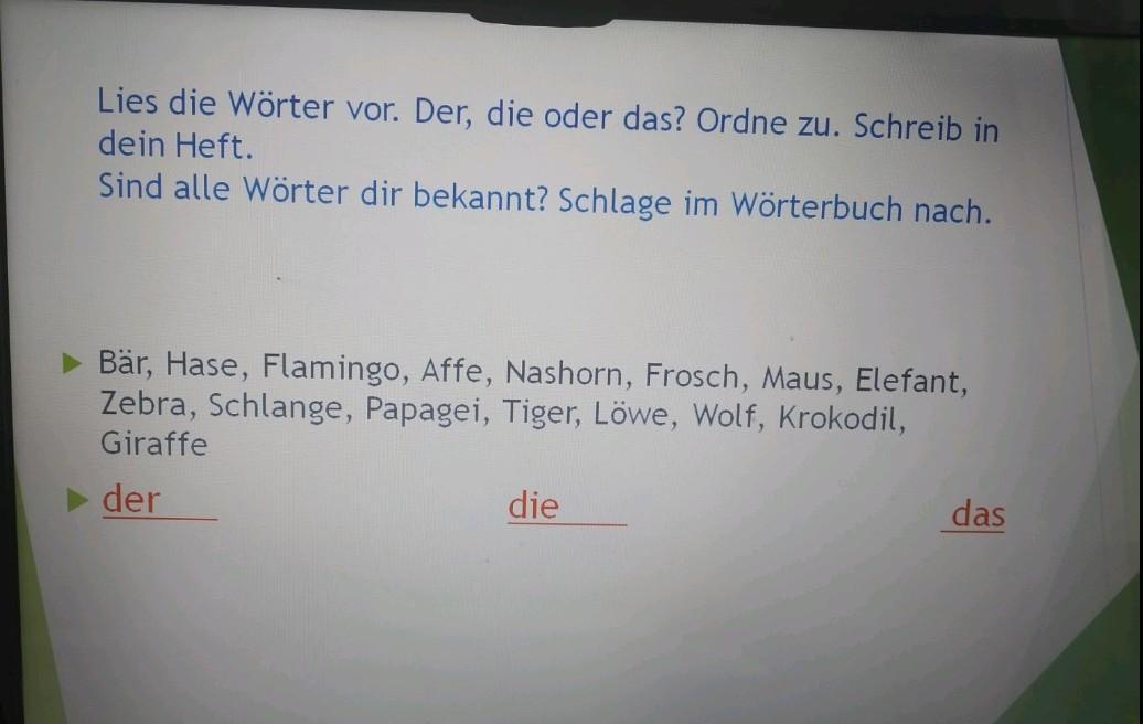 Der Bär,Der Hase,Das Nashorn,Der Elefant,Das Zebra,Der Löwe,Die Maus,Der Wolf,Der Tiger,Der Papagei,Das Krokodil,Die Giraffe,der Affe,der Frosch,Die Schlange,Der Flamingo
