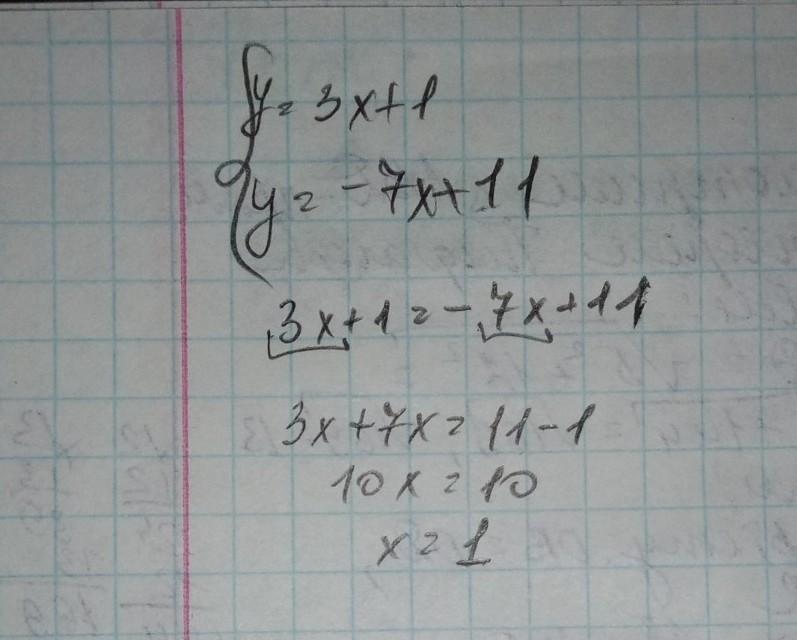 Визнач точку перетину прямих y=3x+11 і y=−7x+11, не виконуючи побудови графіків.