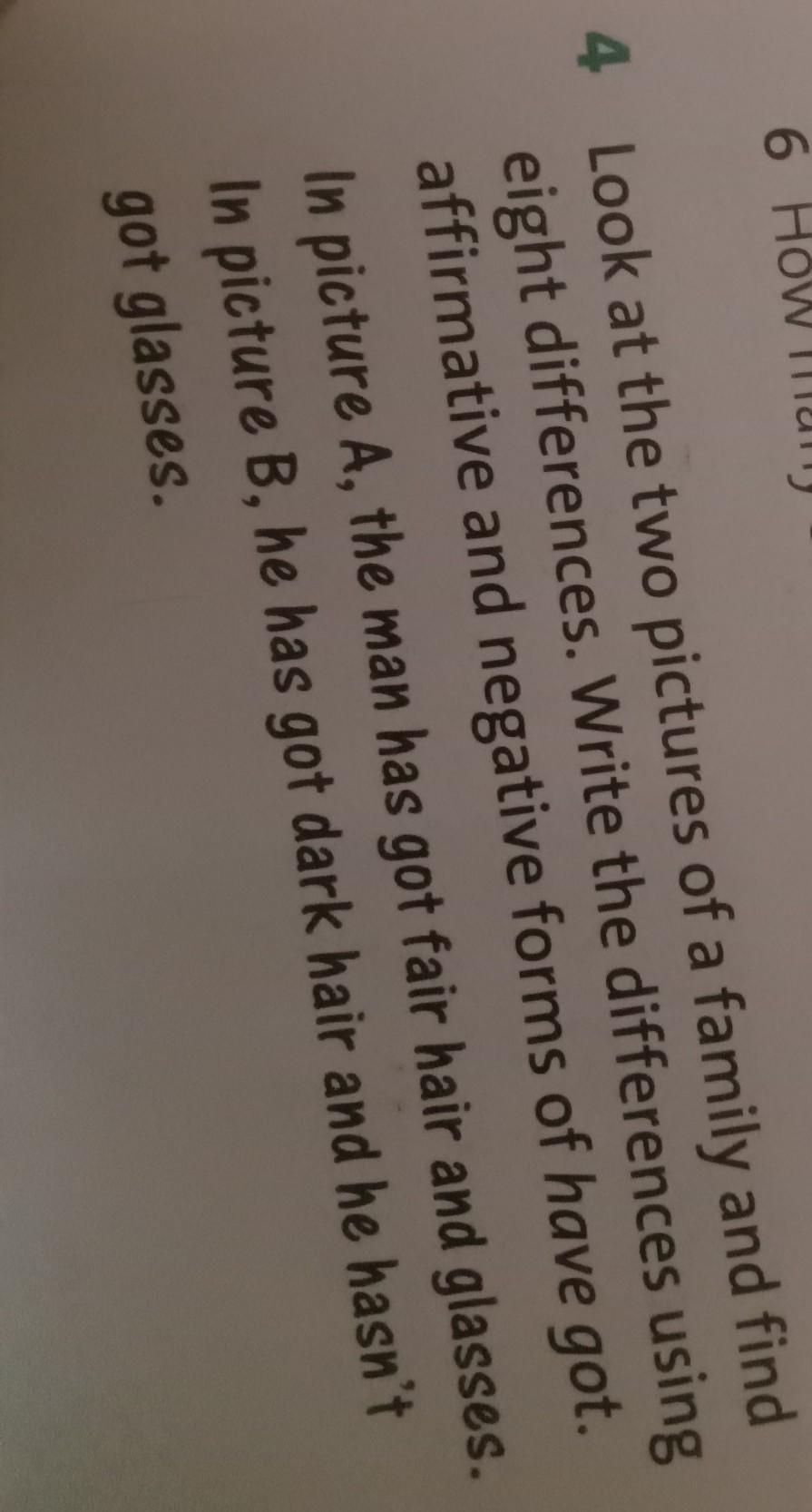 Look at the two pictures of a family and find eight differences.Write the differences using affirmative and negative forms of have got