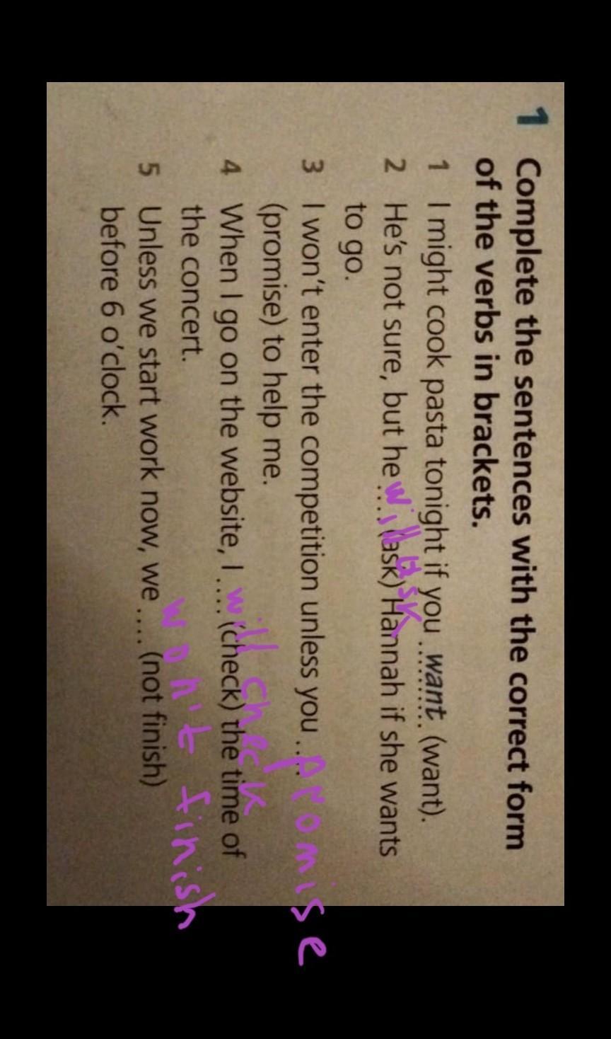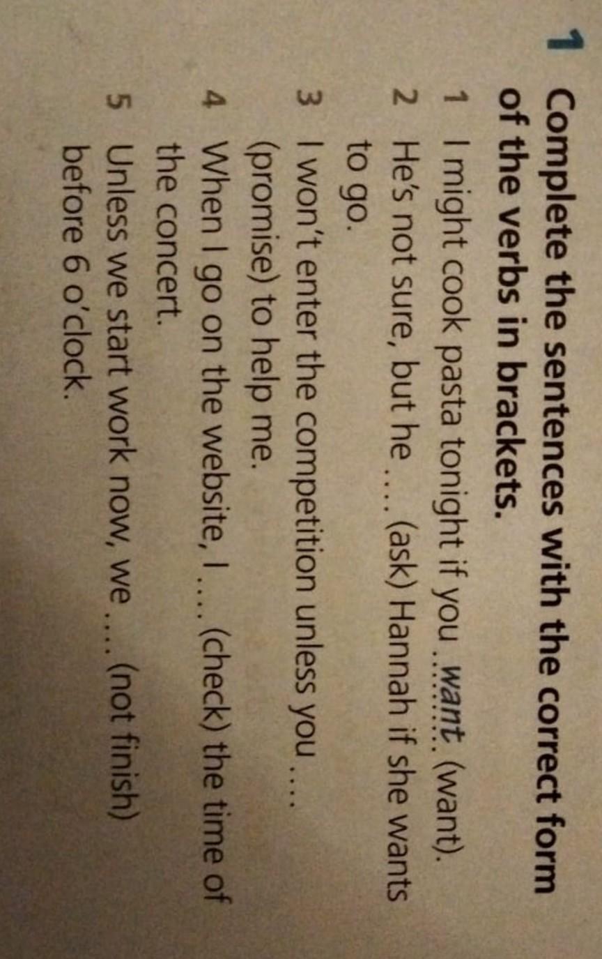 ПОМОГИТЕ ПРОШУ!!!! ДАЮ 50 БАЛЛОВ!!!!! 1 Complete the sentences with the correct form of the verbs in brackets. 1 I might cook pasta tonight if you want (want). 2 He's not sure, but he (ask) Hannah if she wants to go. .... 3 I won't enter the competition unless you.... (promise) to help me. 4 When I go on the website, I.. (check) the time of the concert. (not finish) 5 Unless we start work now, we before 6 o'clock.