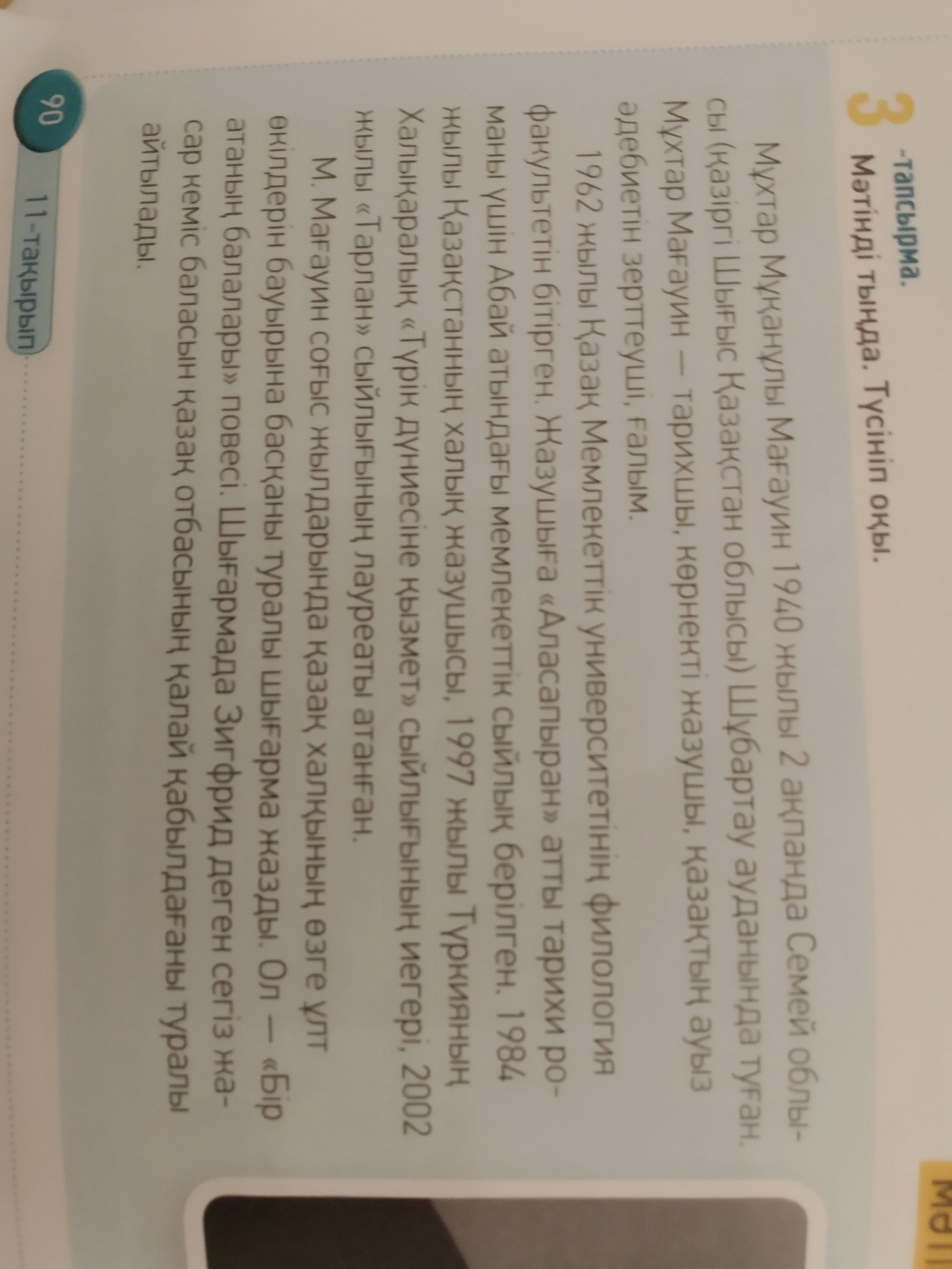 3 -тапсырма. Мәтінді тыңда. Түсініп оқы. сы Мұхтар Мұқанұлы Мағауин 1940 жылы 2 акпанда Семей облы (қазіргі Шығыс Қазақстан облысы) Шұбартау ауданында туған. Мұхтар Мағауин — тарихшы, көрнекті жазушы, қазақтың ауыз әдебиетін зерттеуші, ғалым. 1962 жылы Қазақ Мемлекеттік университетінің филология факультетін бітірген. Жазушыға «Аласапыран» атты тарихи ро маны үшін Абай атындағы мемлекеттік сыйлық берілген. 1984 жылы Қазақстанның халық жазушысы, 1997 жылы Түркияның Халықаралық «Түрік дүниесіне қызмет» сыйлығының иегері, 2002 жылы «Тарлан» сыйлығының лауреаты атанған. Мағауин соғыс жылдарында қазақ халқының өзге ұлт өкілдерін бауырына басқаны туралы шығарма жазды. Ол – «Бір атаның балалары» повесі. Шығармада Зигфрид деген сегіз жа сар кеміс баласын қазақ отбасының қалай қабылдағаны туралы айтылады. М. СОСТАВИТЬ ПЛАН ПО ТЕКСТУ