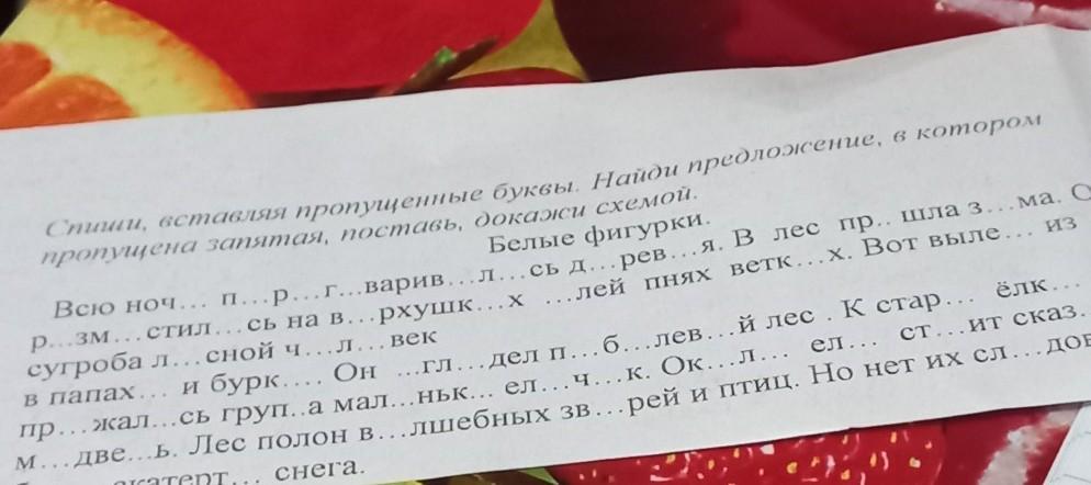 Спиши, вставляя пропущенные буквы. Найди предложение, в котором
