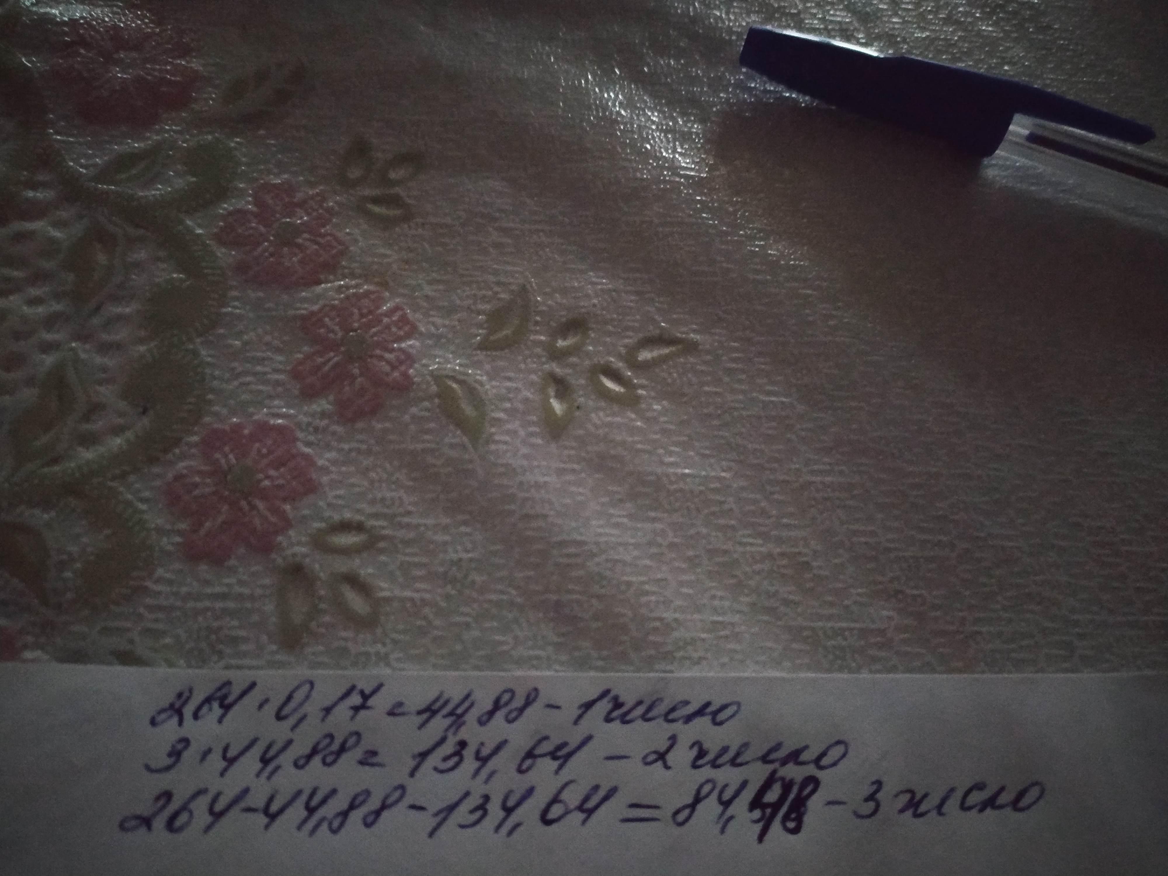 сумма трёх чисел равна 264. Первое число составляет 17% этой суммы. Второе число в 3 раза больше первого. Найди третье число.